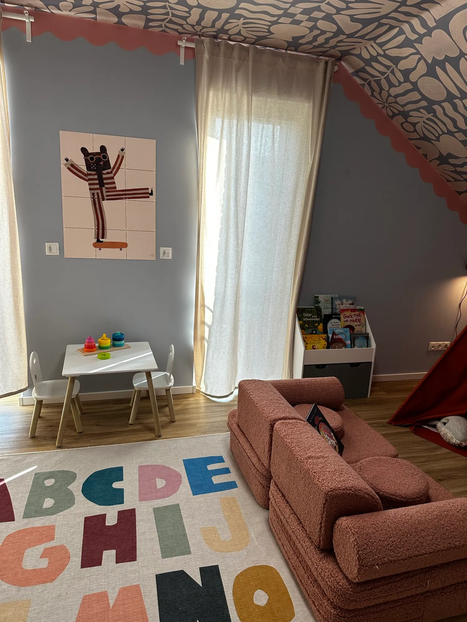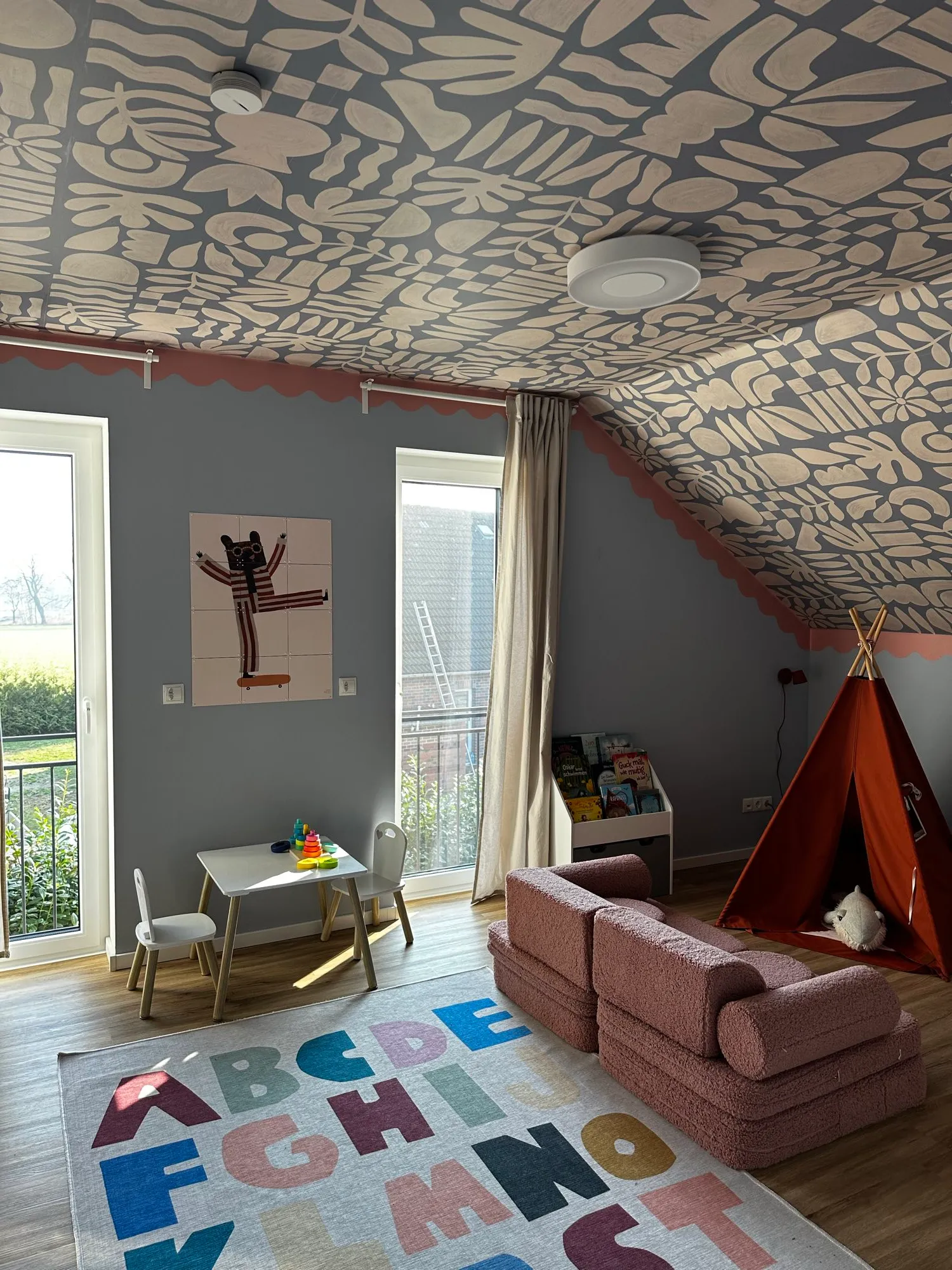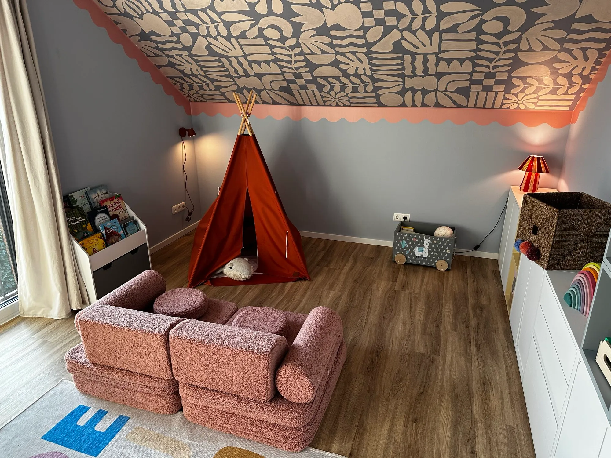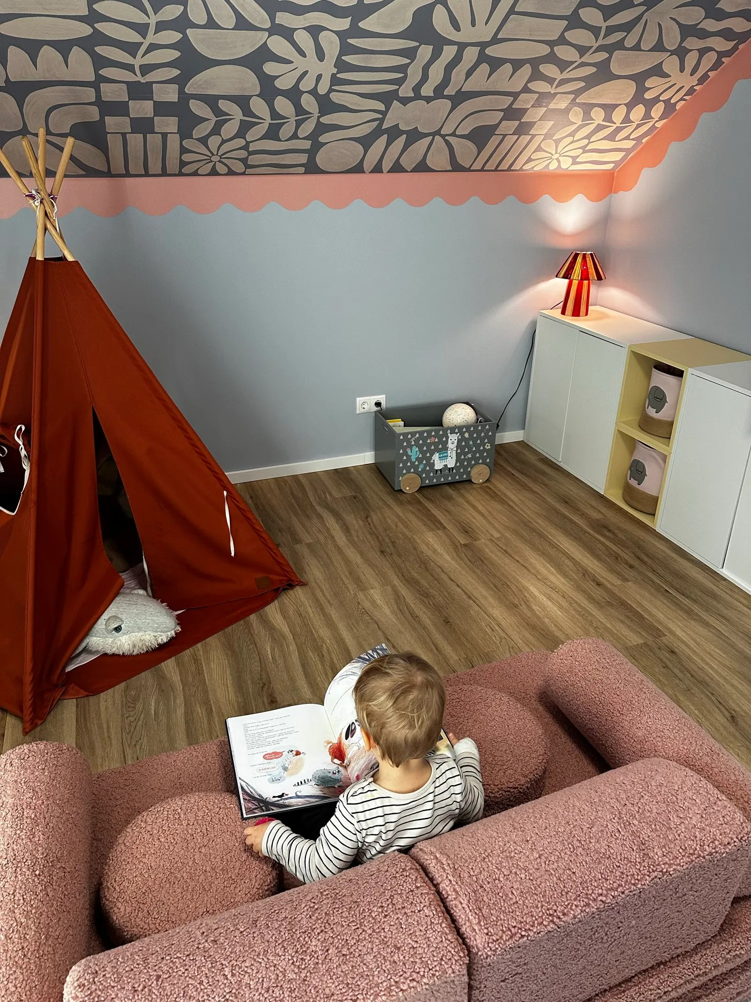 We set out to create a room where play could unfold freely and without rules. Flexible furniture, soft materials, and a ceiling that invites imagination allow the space to shift from calm moments to castles, stories, and movement.